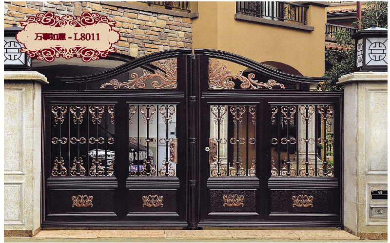 5、鋁藝大門實用性,殊工藝處理,形成永久保護膜,光滑平整,永不生銹,清潔方便,不需保養。也不會因為風吹日曬影響表面的效果,作為庭院門特別的實用。鋁藝大門的使用壽命很長,有些材料比如鐵藝大門等就比較容易生銹,需要定期的養護,但是鋁藝大門不會因為在室外就生銹或者是氧化,可以使用幾十年,不僅節省了養護的麻煩,還提高了性價比。鋁藝大門的硬度也比較高,不會輕易的變形或者是破裂,表面效果非常的光滑,顏色和樣式的可選性也很高,可以根據自己的喜好選擇。
